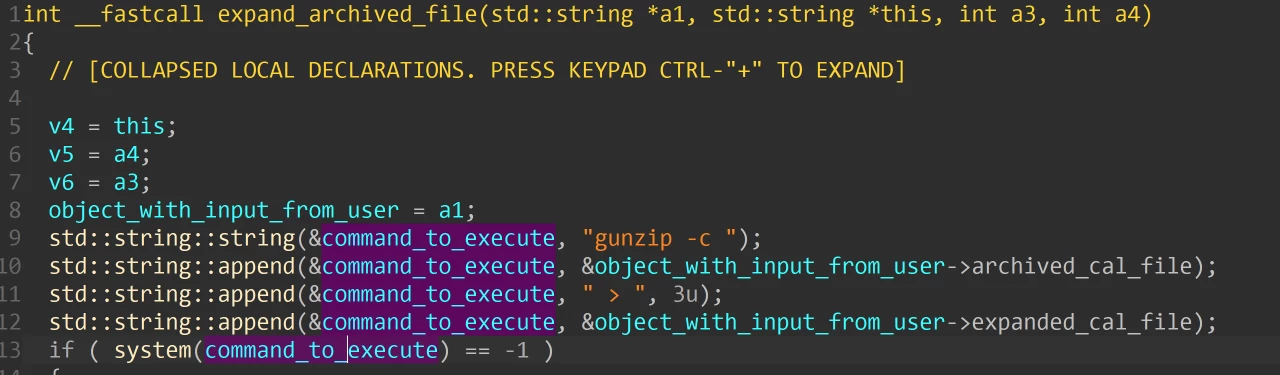 The system function is called with a constructed shell command; the archived file is expanded using gunzip and the name of the file is provided by the user. The command then is executed in the context of the root shell (the application is run by root).