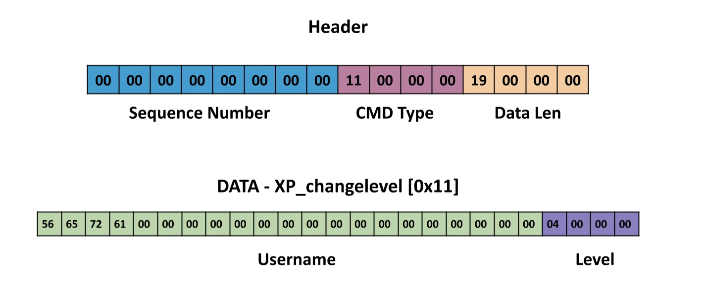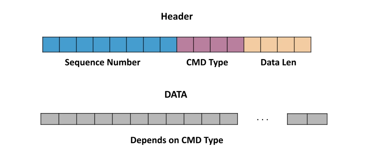 The protocol’s payload consists of an eight-byte header followed by data. The header includes sequence number, the command type ID, and the length of the payload.