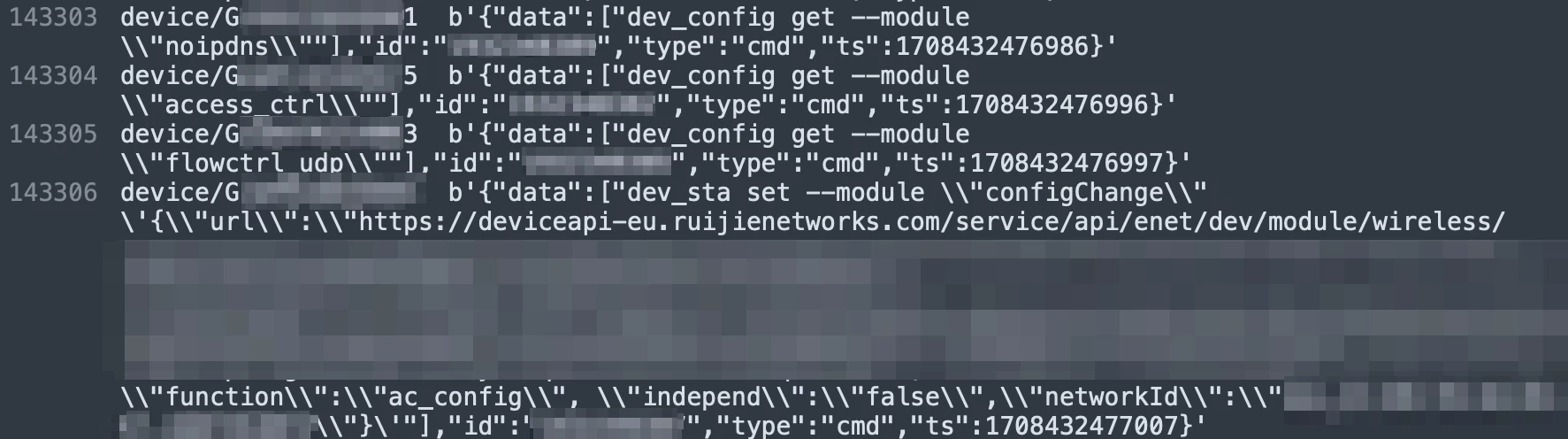 After having access to a serial number, we implemented a simple Python script to connect to Ruijie’s MQTT broker, and it worked, giving us the ability to authenticate as a device to the MQTT broker.