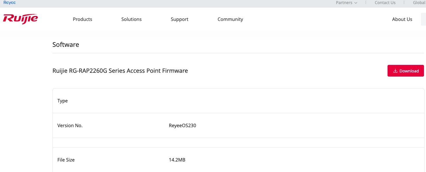 We purchased a Ruijie access point hoping to be able to research the firmware; some IoT vendors will gate their firmware downloads from users. Ruijie, however, allows firmware downloads from its website.