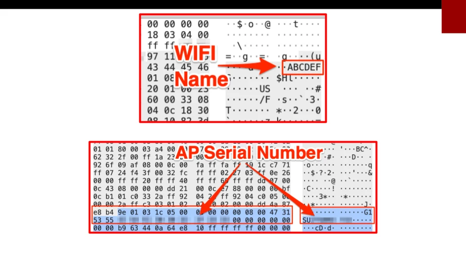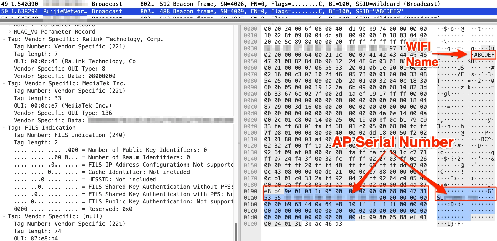 When examining these messages, and looking in the vendor-specific data field (a field allowing the vendor to publish any data they choose), we discovered that the device actually publishes its serial number!