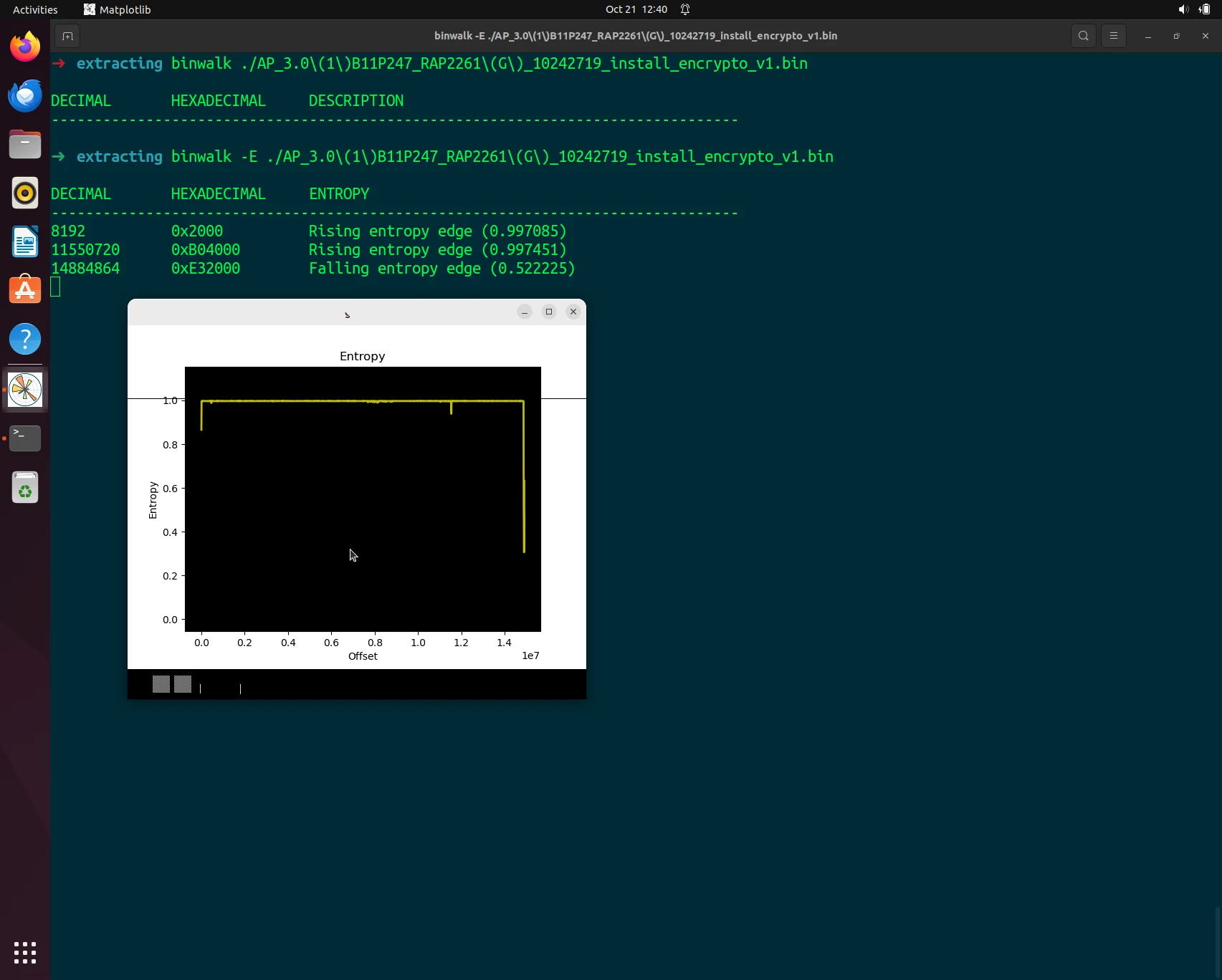 When gaining access to a firmware blob, the first step is usually to examine whether the file is encrypted, or packed. To do so, the simplest method is to check the entropy of the file; if the entropy measured on the file is high, it is very likely encrypted/packed. When we examined the firmware file we downloaded, this was exactly the case.