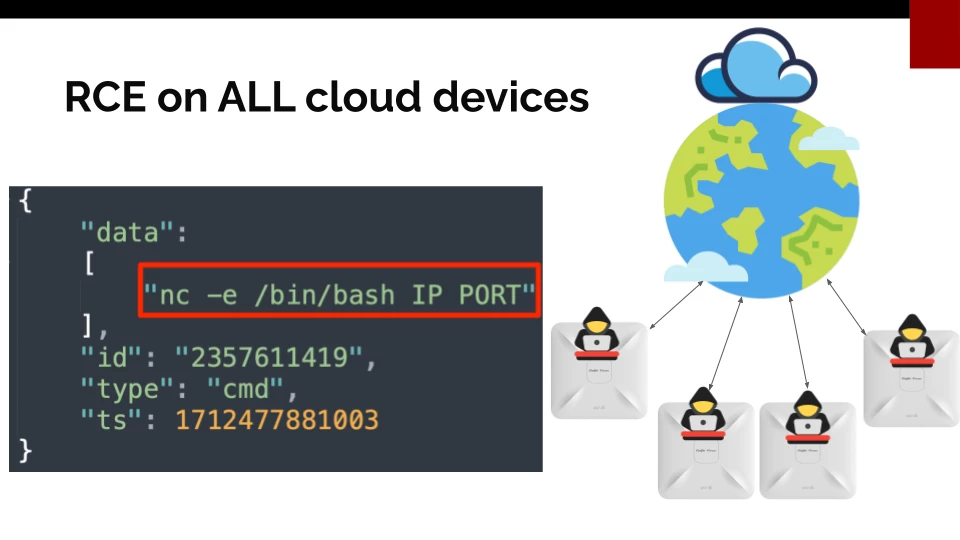 This means that in order to control devices through the cloud, Ruijie implemented an RCE-as-a-service, allowing them to execute OS commands on all cloud connected devices. We then tried seeing if we could send a command to a device, impersonating the cloud, and we were surprised to find out that we could!