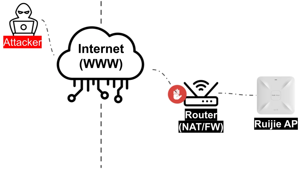 In addition to the vulnerabilities, Team82 devised an attack scenario we call Open Sesame. Here, an attacker in close physical proximity to a Ruijie Reyee OS access point could exploit and leak identifiers over-the-air, and attack the device through the Ruijie cloud platform, giving them remote code execution on the device and access to its internal network.