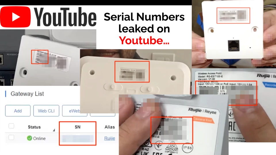 This means that by knowing a device’s serial number, we could generate its MQTT username/password pair, and authenticate to Ruijie’s MQTT broker on its behalf. The issue is that serial number is not a strong identifier because it usually follows a sequential pattern. To make matters worse, often users/developers leak devices' serial numbers, which means that these leaks actually leak the devices’ credentials, because they are generated from the same identifier. To showcase this issue, we simply searched for Ruijie access point unboxing videos on YouTube, which netted us with half a dozen serial numbers for real users’ devices.