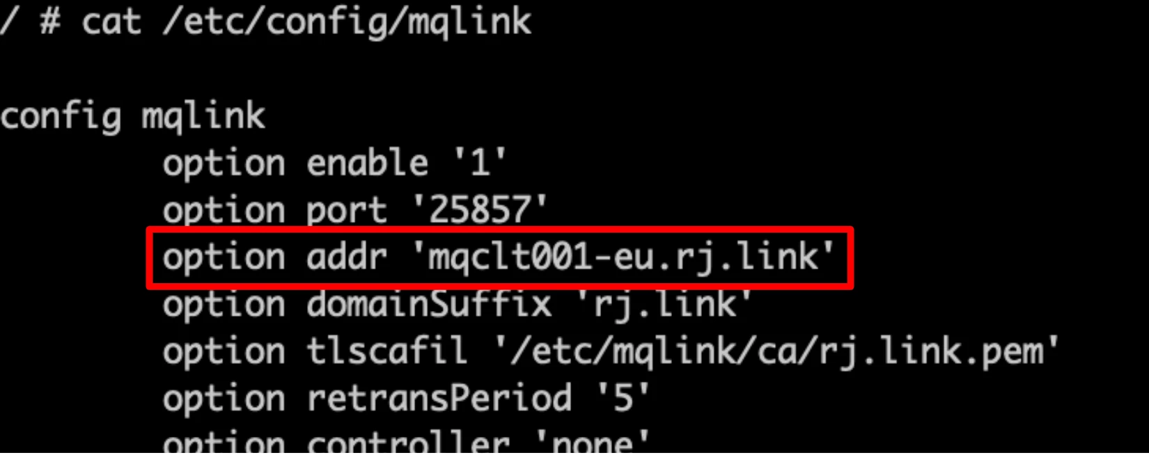 Luckily for us, we identified a configuration file (located under /etc/config/mqlink) which contains the endpoint and port used by Ruijie: