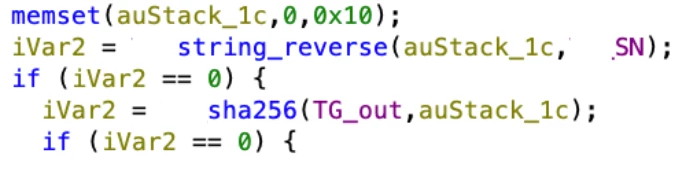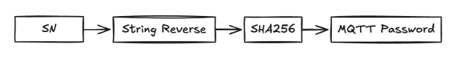Then, it generates the password in the following manner: first it takes the SN, reverses it, and performs a SHA256 calculation on it. This is then used as the password for the MQTT connection.